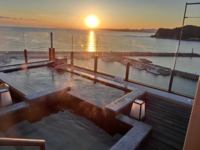 当日も、お陰様の晴天で、屋上の露天風呂からきれいな夕日を眺める事が出来ました。
