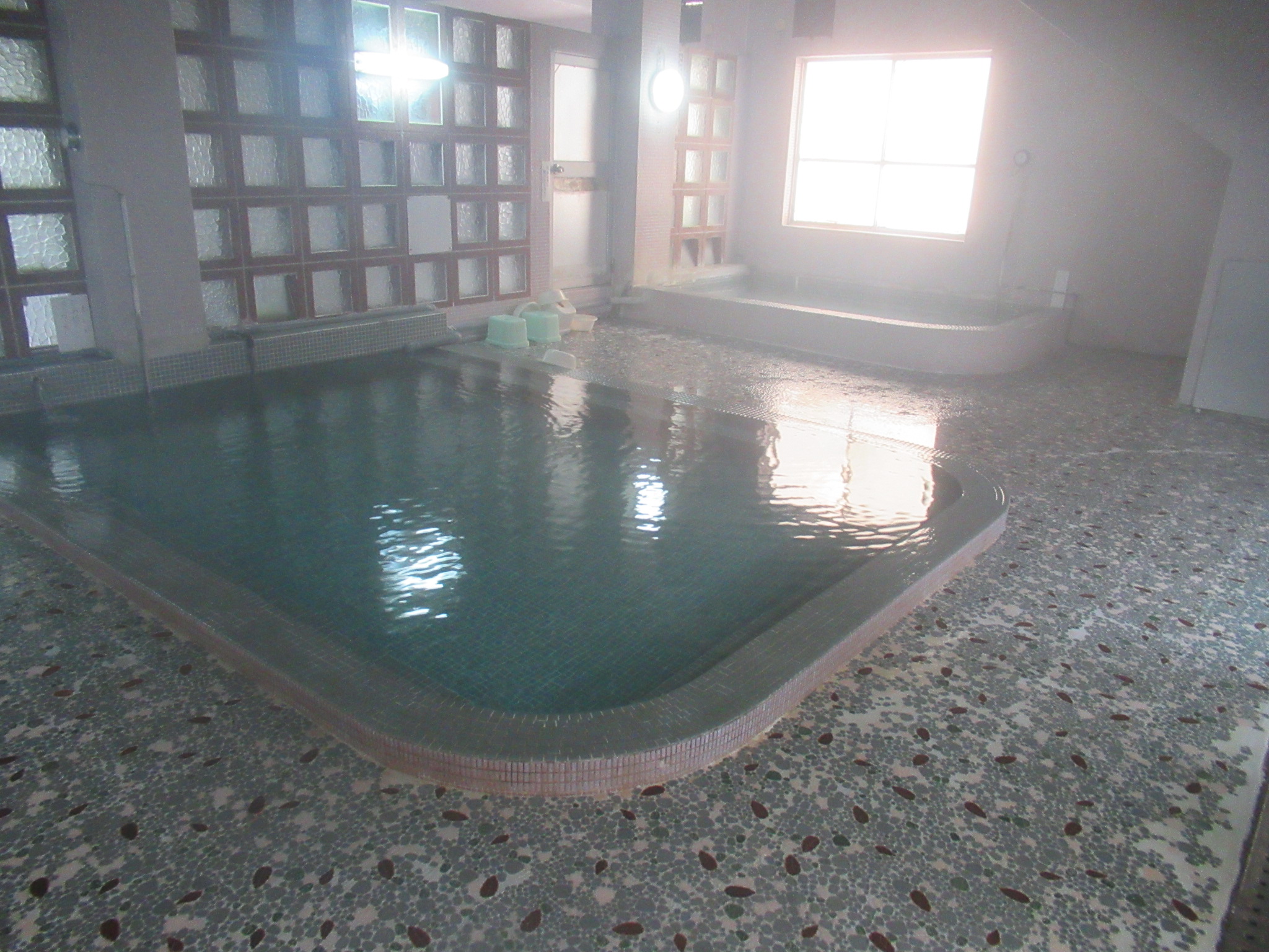 大きな源泉槽は細いパイプから直接ぬるい源泉が勢いよく流れ、全体的にはプールの水のような温度になっています。