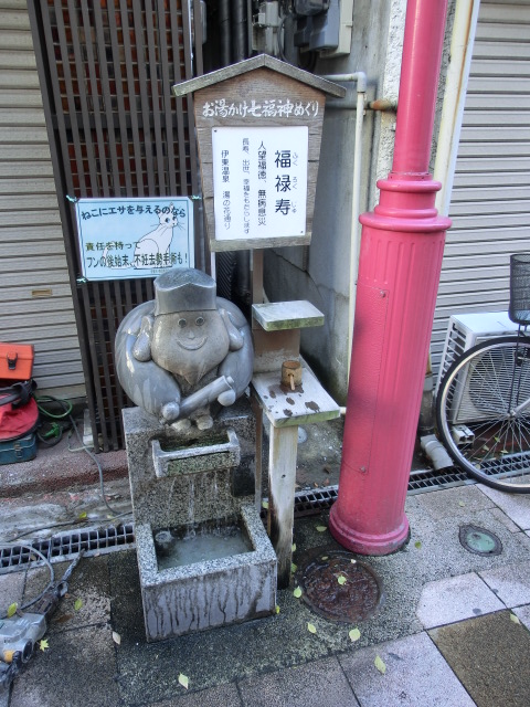 伊東温泉の共同浴場にはそれぞれ七福神の像が立っていますが、この商店街にも七体の像が立ち、その像の前には温泉が流れ、その温泉を像にかけながら商店街を歩く仕組みです。