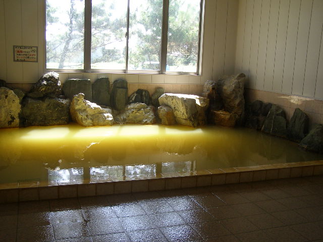 温泉は加熱掛け流しの黄褐色の濁り湯で、かなり塩辛い味です。