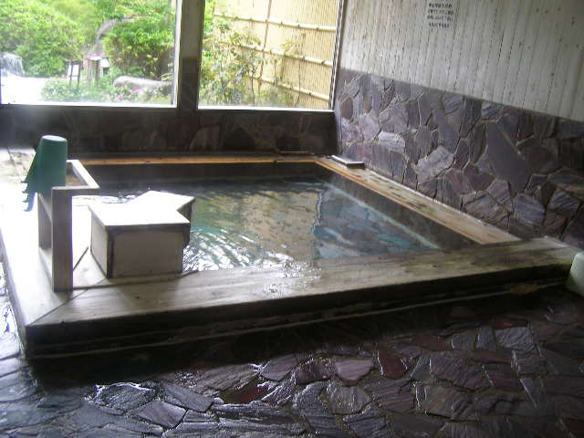 内湯には広い大きな岩風呂があり、その反対側には、檜の浴槽があります。