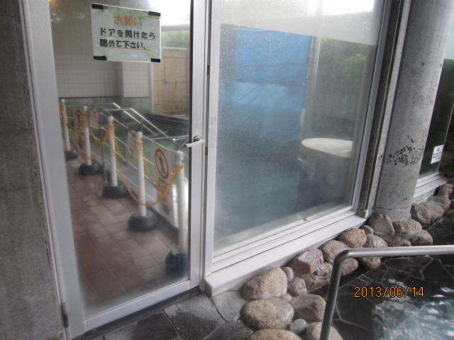 内湯の前の大きなガラスが割れて浴槽にガラス片が落ちているようで、入れないようにロープで遮断されていました。