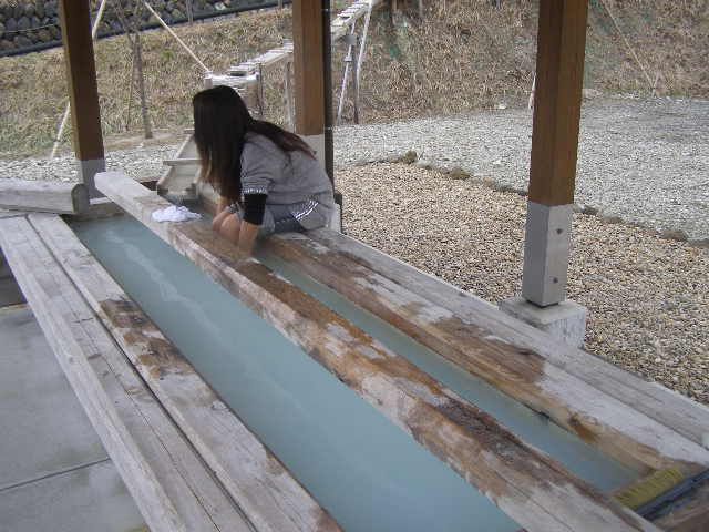 ところで、この湯めぐり駐車場の足湯は、遠くから硫黄の臭いがプンプン、駐車場のわきには温泉の櫓があり、蒸気がモウモウ、そこから木の樋を通して源泉がそのまま薄めずに直接流れてきます。