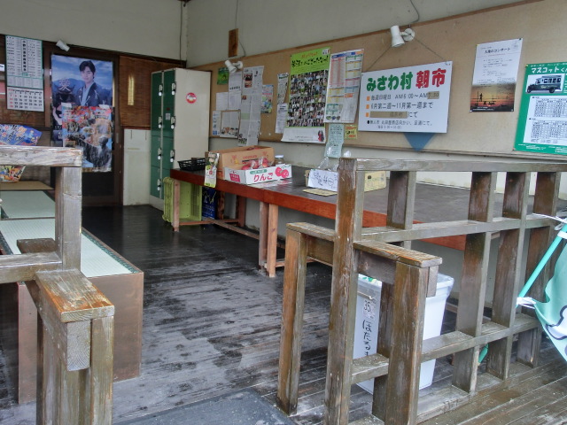 足湯は、屋根の付いた休憩所になっており、イスやテーブルもあり、壁際には地元の野菜や果物の無人の直売所にもなっており、情報収集用のパンフレットも並んでいます。