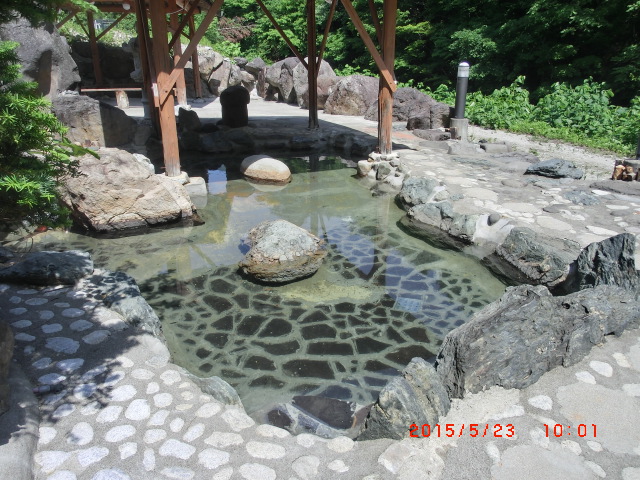 露天風呂は、河原に降りた所にあり、かなり広い浴槽ですが、白湯が入っていました。