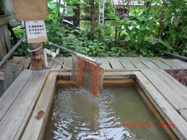 足湯の浴槽の上のには、金網がぶら下がっていて、その上から源泉が流れ落ちています。