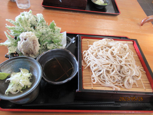 いかにも季節限定の商品なので、早速、もりそばに山菜天を注文しました。