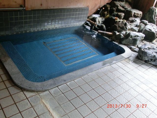 浴室に入ると、奥に岩が積み上げられ、男女の壁の仕切りの下に飲泉用の源泉が貯められ、両方から飲めるようになっています。