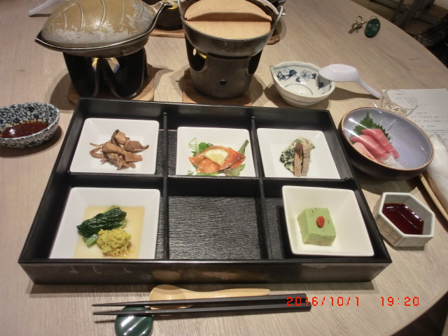 夕食は、小鉢が乗ったお膳に、地元銘柄豚の陶板焼きと合鴨鍋がメインとなり、それにお造りが付いたシンプルな内容でした。