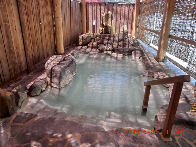 露天風呂は、太い丸柱の屋根に覆われ、周りは簾で覆われ、そのせいか、虫一匹落ち葉の一枚も見当たらず、綺麗に管理されており、一人で気持ち良く独占出来ました。